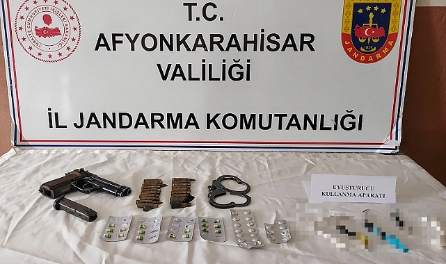 İhbarları değerlendiren ekipler, Sinanpaşa'nın Düzağaç beldesinde durdurulan araçta ve Dinar ilçesi Aktoprak köyünde belirlenen adreslerde yaptığı aramalarda, 196 uyuşturucu hap, tabanca, kurusıkı tabanca, 2 şarjör, 12 mermi, kelepçe ve 2 uyuşturucu kullanma aparatı ele geçirdi.