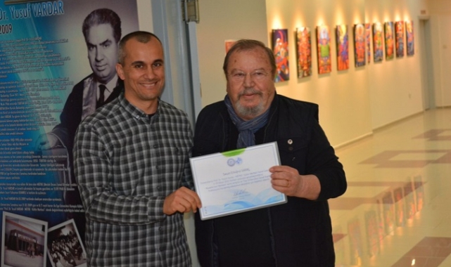 Açılış konuşmasının ardından, EÜ Kültür ve Sanat Hizmetleri Şube Müdürlüğü Birim Sorumlusu Arda Peksev tarafından sanatçı Ertuğrul Saraç’a “Teşekkür Belgesi” verildi.