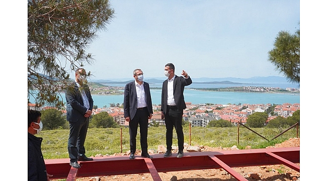 Cennet Tepesi’ne kafeterya yapılarak yaz başında hizmete açılacağı konusunda verdiği sözü yerine getirdiğini hatırlatan Belediye Başkanı Ergin, “Uzun yoldan gelip, kentimize Ahmet Taner Kışlalı Caddesi’nden giriş yapan yerli ve yabancı konuklarımızın, muhteşem manzara eşliğinde çam ağaçlarının gölgesinde soluklanacağı bir ortama yaratıyoruz. Kentimizin bu yüksek tepesinden Cunda ve diğer adalar izlenecek, çayı, kahve, meşrubat içilecek, tatile keyifle başlanacak. Seyir teraslı, prefabrik kafeteryayı çevre düzenlemesini de tamamlayarak, yaz sezonuyla birlikte hizmete açmayı planlıyoruz” dedi.