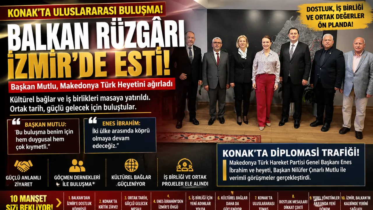 Konak Belediye Başkanı Nilüfer Çınarlı Mutlu, Makedonya Türk Hareket Partisi lideri Enes İbrahim ve beraberindeki heyeti ağırladı. Görüşmelerde kültürel bağlar ve uluslararası iş birlikleri öne çıktı.