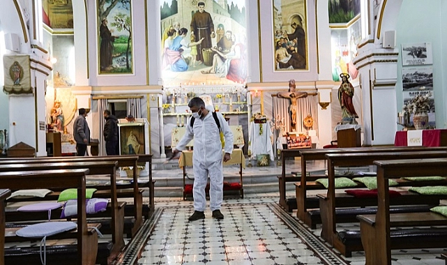 Bayraklı Belediyesi, ilçe genelindeki ibadethanelere yönelik temizlik ve hijyen çalışmalarına hız verdi. İlçe genelindeki camiler, cemevleri ve kilise hazırlanan program kapsamında ilaçlanmaya başlandı. Uygulama kapsamında ibadethaneler sıra ile dezenfekte edilip ilaçlanırken, vatandaşlara daha hijyenik ortamlarda ibadet etme imkanı sağlanacak.