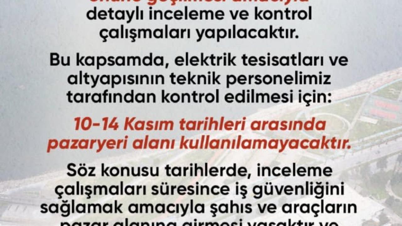 Karşıyaka Belediyesi, Bostanlı Pazaryeri’nde çatı oluklarından kaynaklanan su akıntılarının elektrik panoları ve tesisatta olası tehlike yaratma riski taşıması nedeniyle detaylı inceleme ve kontrol çalışması yapılacağını açıkladı. Belediye duyurusunda, altyapı ve elektrik tesisatının teknik personel tarafından kontrol edileceği belirtilerek pazar yerinin 10–14 Kasım tarihleri arasında kullanılamayacağı duyuruldu. Bu süre zarfında pazar alanına şahıs ve araç girişinin yasak olacağı, pazar faaliyetlerine geçici ara verileceği bildirildi.