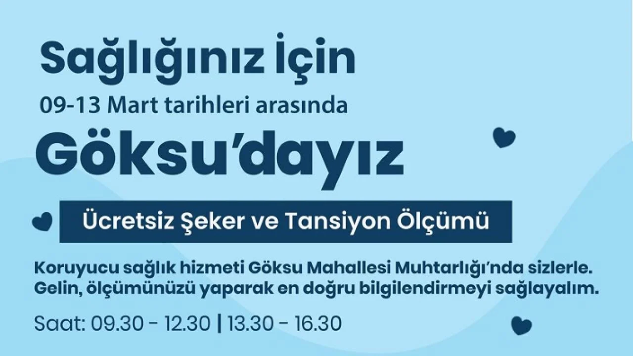 Sosyal belediyecilik anlayışıyla yürütülen projenin ilk uygulaması Göksu Mahallesi Muhtarlığı’nda gerçekleştirilecek. 9–13 Mart tarihleri arasında düzenlenecek sağlık taramalarında vatandaşlara ücretsiz olarak şeker ve tansiyon ölçümü yapılacak. Ölçümlerin ardından katılımcılara sağlık durumları hakkında bilgilendirme de yapılacak.