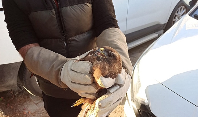 Araç kaputuna sıkışan şahin, belediye ekiplerince kurtarıldı