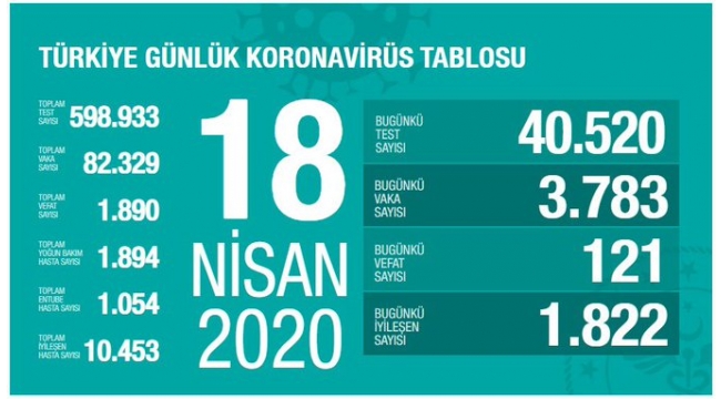 Toplam test sayısı 598 bin 933, toplam vaka sayısı 82 bin 329, toplam vefat sayısı 1890, toplam yoğun bakım hasta sayısı 1894, toplam entübe hasta sayısı 1054, toplam iyileşen hasta sayısı 10 bin 453 oldu.