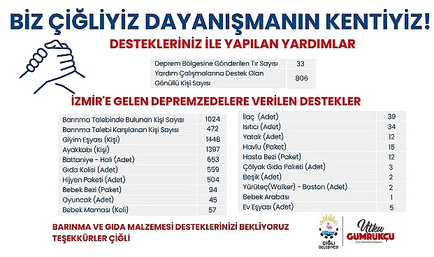 Başkan Utku Gümrükçü’nün çağrısıyla başlatılan dayanışma seferberliği iş insanları, esnaflar, sivil toplum kuruluşları, dernekler ve Çiğlili vatandaşların katkılarıyla depremin 12. gününde hız kesmeden sürüyor. Çiğli Belediyesi Deprem Koordinasyon Merkezi’nin organize ettiği ve 806 gönüllü vatandaşın destek verdiği çalışmalar kapsamında deprem bölgesine gıda, giyim, ilaç, yakacak vb. eşyaların taşındığı 33 dayanışma tırı gönderildi.