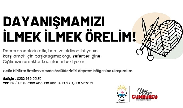 Çiğli Belediyesi Merkez üssü Kahramanmaraş olan ve 10 ilde de yıkıma neden olan 7.7 ve 7.6 büyüklüğündeki depremler sonrasında seferber oldu. Belediye Başkanı Utku Gümrükçü “Haydi Çiğli Dayanışma Vakti” diyerek destek çağrısı yapmıştı. Şimdi de “Gelin Dayanışmamızı İlmek İlmek Örelim” Kampanyası için çağrıda bulundu.
