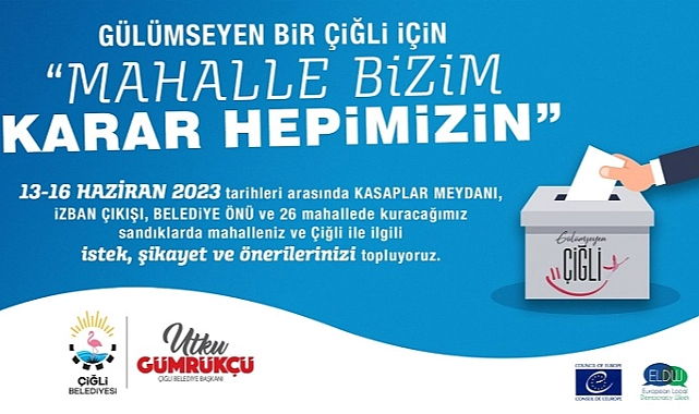 Başkan Utku Gümrükçü’nün göreve gelmesiyle başlayan sandık uygulaması 13-16 Haziran 2023 tarihleri arasında 26 mahallenin tamamında gerçekleştirilecek. Mahalle muhtarlıklarının yanı sıra insan sirkülasyonunun yoğun olduğu Çiğli Belediyesi önü, Çiğli İZBAN aktarma merkezi ve Kasaplar Meydanı’nda da sandık kurulacak. Sandık başlarında belediye personelleri görev yapacak. Vatandaşlar dört gün boyunca sandıklara giderek ikamet ettiği mahalle ve Çiğli’nin genel durumuyla ilgili talep ve önerilerini belirtebilecek.
