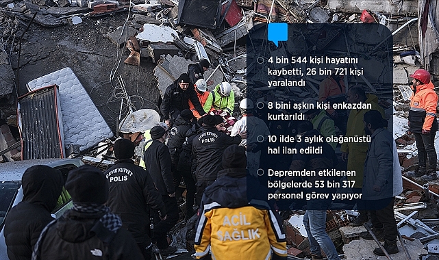 AFAD, Kahramanmaraş merkezli depremlerde 4 bin 544 kişinin hayatını kaybettiğini, 26 bin 721 kişinin yaralandığını, yıkılan bina sayısının 5 bin 775 olduğunu bildirdi.