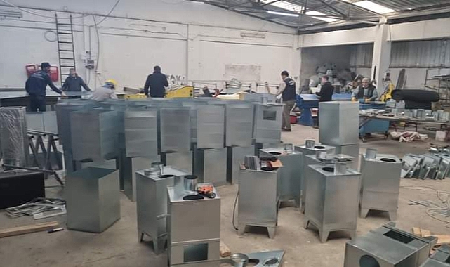 saçtan fan imalatı atölyesi bulunan Pınarbaşılı Hüseyin Avcu ve çalısanları gece gündüz demeden, depremzedelere soba yapıyor.