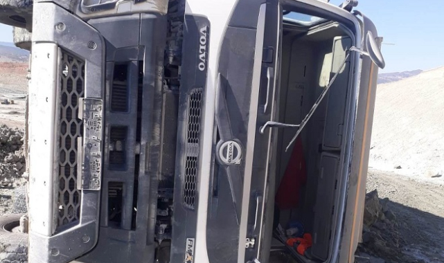 Zülküf Akarsu (43) yönetimindeki 06 BEJ 299 plakalı kamyon, bor maden sahasında rampa çıktığı sırada kayarak devrildi.