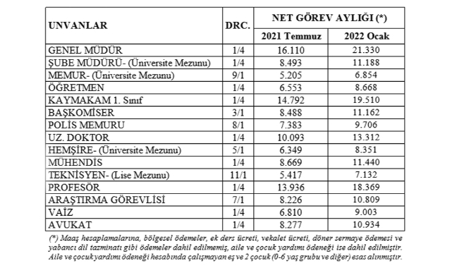 Bu çerçevede aile yardımı ödeneği dahil en düşük memur maaşı 4881 liradan 6429 liraya, en düşük memur emekli aylığı 3276 liradan 4289 liraya yükseldi.