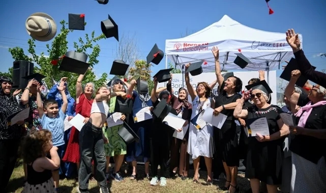 İZMİR (İGFA) - İzmir'de 60 yaş üstü Bornovalılar keplerini coşkuyla havaya atarken, Başkan Ömer Eşki merkezin huzur ve mutluluk veren ortamına dikkat çekerek katkı sunanlara teşekkür etti. Törende, merkezin kurulduğu arsayı bağışlayan Gündüz çiftine de anlamlı bir hediye takdim edildi. Bornova Belediyesi'nin Özgül Gündüz Sağlık Köyü'nde projelendirdiği Sağlıklı Yaş Alma Merkezi, ilk mezunlarını verdi. Bahçede düzenlenen törende mezuniyet belgelerini Bornova Belediye Başkanı Ömer Eşki'nin elinden alan 60 yaş üstü Bornovalılar, keplerini büyük bir coşku ve gururla havaya fırlattı. Törenden önce Şef Selda Kesgi yönetiminde sahne alan Sağlıklı Yaş Alma Merkezi Korosu marşlar ve şarkılar seslendirdi, ardından yaş almış bireyler uzman eğitmenler eşliğinde spor etkinlikleriyle güne enerji kattı.