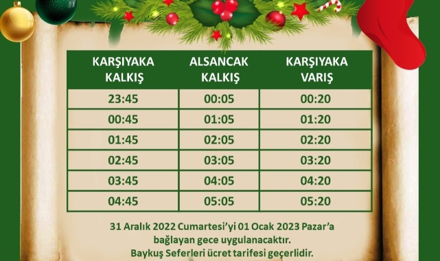 İZDENİZ’e bağlı vapurlar 31 Aralık tarihinde her zaman uyguladığı haftasonu tarifesine göre hareket edecek. 31 Aralık’ı 1 Ocak’a bağlayan gece ise ihtiyaç halinde ek seferler uygulanacak. Alsancak –Karşıyaka arasında yapılan Baykuş seferleri saat 05.00’a kadar devam edecek. 01 Ocak 2021 Pazar günü ise yolcu gemileri ve arabalı vapurlar yine haftasonu tarifesine göre çalışacak. Bostanlı – Üçkuyular – Bostanlı hattında arabalı vapur seferleri 11.00’de başlayacak.