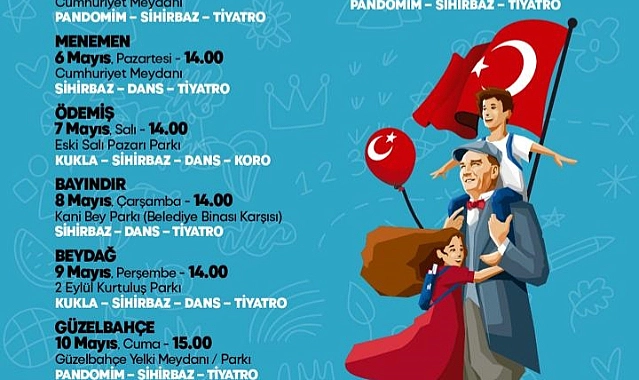 İzmir Büyükşehir Belediyesi, 23 Nisan Ulusal Egemenlik ve Çocuk Bayramı’nı kentin 30 ilçesinde 30 gün boyunca büyük bir coşkuyla kutlayacak. İlçelerde “Gezici Çocuk Şenliği” ile çocuklar bayram coşkusunu doyasıya yaşacak, 23 Nisan Salı günü ise Kültürpark büyük bir etkinliğe ev sahipliği yapacak. Bayram günü toplu ulaşım araçları ücretsiz olacak. İzmir Doğal Yaşam Parkı ise 6-18 yaş arasındaki ziyaretçilerini 22-28 Nisan tarihlerinde ücretsiz ağırlayacak.