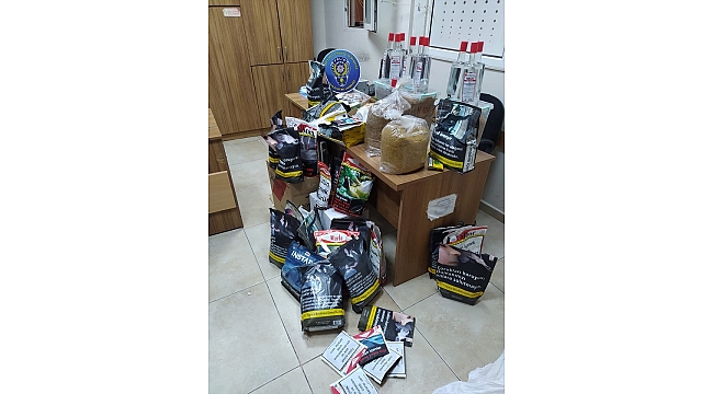 Yapılan aramada kaçak olduğu tespit edilen 31 kilogram tütün, 10 şişe etil alkol ve 77 paket sigara ele geçirildi.