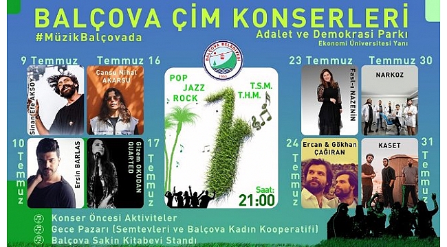 Balçova Çim konserlerinde her hafta bir tarzda iki ayrı konser olacak. Pop Haftasında Sinan Efe Aksoy ve Ersin Barlas, Jazz Haftasında Cansu Nihat Akarsu ve Gizem Okudan, Türk Sanat Müziği ile Türk Halk Müziği haftasında Fasl-ı Nazenin ile Ercan-Gökhan Çağıran, Rock Konserleri haftasında ise Narkoz ve Kaset Grupları ayrı ayrı sahne alacak. Konserler öncesinde karaoke yarışmaları, Dj etkinlikleri yapılacak.