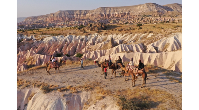 Son yıllarda ilginin arttığı deve turuna katılan turistler, Kapadokya'daki peribacaları ve doğal kaya oluşumlarıyla kaplı vadilerde gezinti yapıyor.