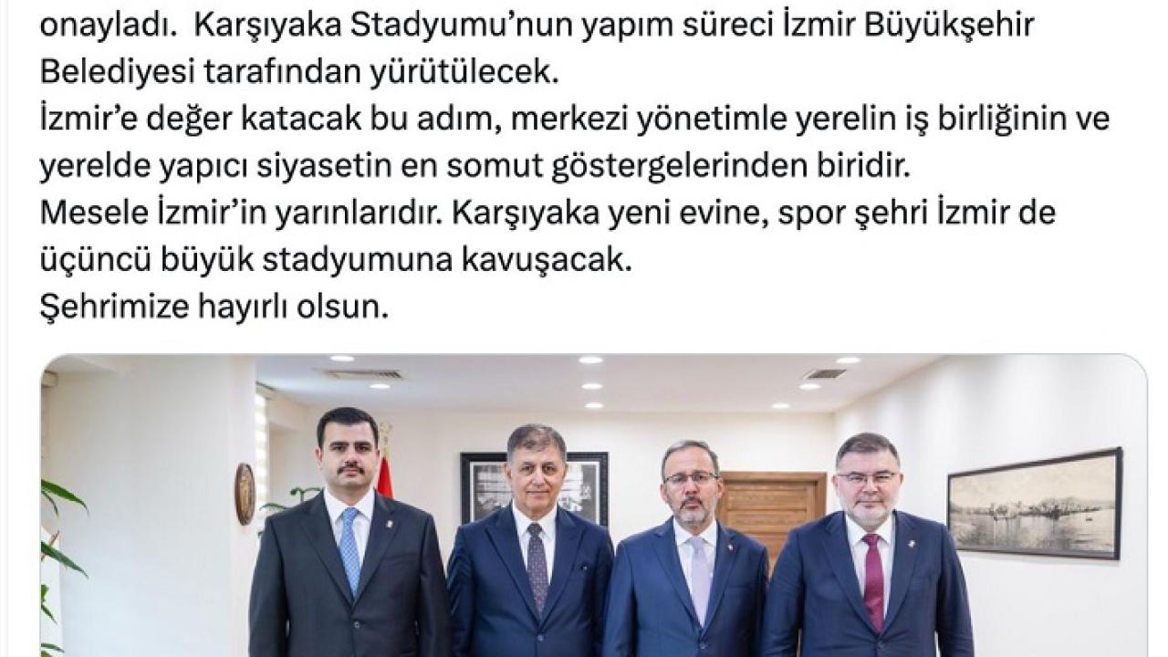 AK Parti İzmir Milletvekili Dr. Mehmet Kasapoğlu, AK Parti Genel Sekreteri ve İzmir Milletvekili Eyyüp Kadir İnan ile AK Parti İzmir İl Başkanı Bilal Saygılı, İzmir Büyükşehir Belediye Başkanı Cemil Tugay’ı ziyaret etti. Görüşmede, İzmir Büyükşehir Belediyesi’nin talebi doğrultusunda Gençlik ve Spor Bakanlığı tarafından hazırlanan “Yeni Karşıyaka Stadyumu Yapım ve Ortak Kullanım Protokolü”ne son şekli verildi.