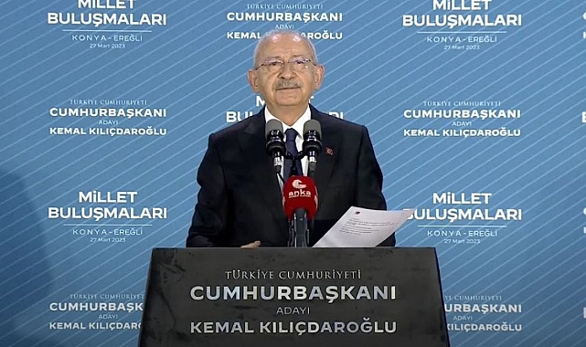 Millet İttifakı Cumhurbaşkanı Adayı ve CHP Genel Başkanı Kemal Kılıçdaroğlu, Konya Ereğli’deki Millet Buluşması’nda, çiftçilere; “Sizin bankalara, Tarım Kredi Kooperatifleri’ne olan faizlerini sileceğiz. Sadece ana parayı, taksitlerle alacağız. Siz üreteceksiniz, siz. Siz, kazanacaksınız. Dışarıdan buğday, dışarıdan arpa, dışarıdan fasulye, dışarıdan canlı hayvan, dışarıdan efendim et, mercimek, bunların tamamını bitireceğiz. Herkes üretecek ve herkes kazanacak” sözleri ile seslendi.