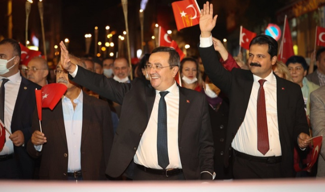 Konak Belediyesi’nin Gültepe’de gerçekleştirdiği Cumhuriyet Kortejinde, Başkan Abdül Batur öncülüğünde ellerinde bayrak ve meşalelerle yürüyen kalabalık, 98 yıldır yolumuzu aydınlatan Cumhuriyet ışığının hiç sönmeyeceğini bir kez daha gösterdi. Kortejin ardından düzenlenen Cumhuriyet Konserinde konuşan Başkan Batur, “Ulu Önderimiz Mustafa Kemal Atatürk’ün bizlere emanet ettiği Cumhuriyete sonuna kadar sahip çıkmaya yeminliyiz. O’nun bize emanet ettiği Cumhuriyete sahip çıkacağız. Cumhuriyeti unu