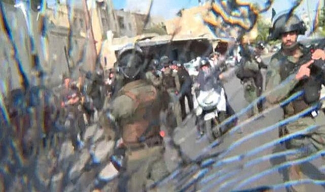 İsrail polisi, bölgede sadece yaşananları haberleştiren TRT Haber ekibine fiziki müdahalede bulunduktan sonra silahının namlusu ile TRT Haber kamerasını kırdı.