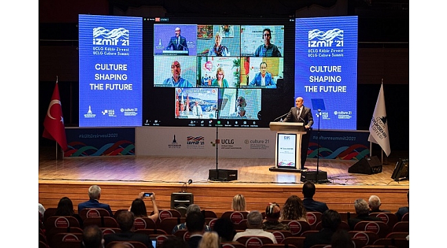 Konuşmasında Covid-19’un iklim krizi ve biyolojik çeşitlilik kayıplarının yanı sıra sürdürülebilir kalkınmayı da tehdit ettiğini dile getiren Başkan Tunç Soyer, “Bunlar sınır tanımayan ortak zorluklarımızdır. Bu bağlamda, sürdürülebilir kentleşme konusunda küresel dayanışma, bu büyük zorluklarla yüzleşmede çok önemli. Kültürel canlılık, ekonomik refah, sosyal eşitlik ve çevresel sorumluluk ile birlikte sürdürülebilirliğin dört ayağından biridir. İzmir, son iki yılda büyük bir orman yangını, tsunami, deprem, kuraklık ve şiddetli sel gördü. Ayağa kalkmak için kültüre yaslandık, çünkü kültür yerel topluluklarımızın can damarı. Kültür, günlük hayatımızın her alanında; hikayelerimizi anlatma, geçmişi hatırlama, iyi vakit geçirme ve geleceği hayal etme şeklimiz. Kültür, tarihimizi geleceğimize bağlar. Bu bizi benzersiz kılan şeydir. Yaratıcı ifademiz kim olduğumuzu ve kim olabileceğimizi tanımlamaya yardımcı olur. Kültür, içsel değerinin yanı sıra şehirlerimiz için önemli sosyal ve ekonomik faydalar sağlamaktadır. Öğrenmemizi geliştirir, toleransı arttırır ve diğerleriyle bir araya gelme fırsatları yaratır. Kültür, yaşam kalitemizi geliştirir ve hem bireyler hem de topluluklar için genel refahı artırır” dedi.