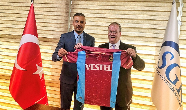 İZMİR (AA) - Sosyal Güvenlik Kurumu (SGK) İzmir İl Müdürü Yavuz Kurt, Trabzonspor taraftarı olduğunu söyleyen Alman Emeklilik Sigorta Kurumları Daire Başkanı Bernd Schmidt'e bordo-mavili forma hediye etti.