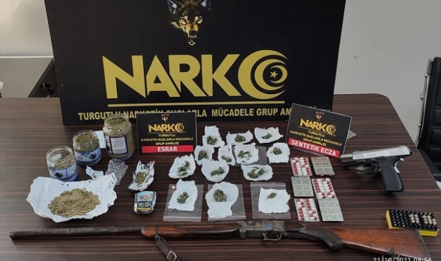 Aramalarda 1 kilo 47 gram esrar, 86 sentetik hap, 0,57 gram Hint keneviri tohumu ile uyuşturucu içiminde kullanılan aparat ele geçirildi. Aramalarda bulunan ruhsatsız tüfek, kuru sıkı tabanca ile 14 fişeğe de el konuldu.