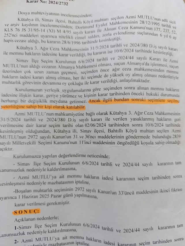 Buna rağmen Kütahya 3. ağır ceza mahkemesinden 31 mayıs da tarihinde memnu hakları kararı çıkarttığı söyleyen Mutlu sözlerine şöyle devam etti, “ Simav ilçe seçim kurulunun 2 Hazirandaki seçimlerine tekrar 2. kez katıldım. Bir hafta içinde bu kararı çıkardık verdik. Bu karara şerh konulmuş. İkinci kez seçime girdim ve kazandım. Bir hafta bekleme süresi ilçe seçim kurulu mazbatamızı vermiyor. vermemek için diretiyor. İlçe seçim kurulu 6 Haziran yüksek seçim kurulundan görüş alıyor. YSK da diyor ki ilçe seçim kurulunu topla karar ver. Buna binaen ilçe seçim kurulu 6 Haziran 2024 toplanıyor 6 kişi şahsıma evet bir kişi red oyu kullanıyor. Buna rağmen muhtarlık mazbatam verilmiyor. Neden ve niçin verilmiyor? O insanlar oraya niçin çağrıldı? Madem o insanların verdiği kararın bir önemi yoksa?” dedi.