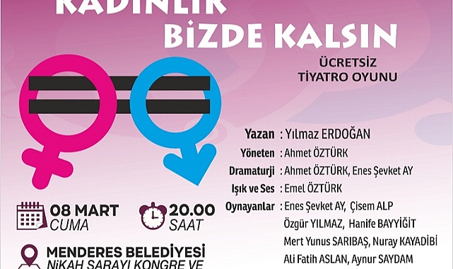 Menderes Belediyesi tarafından 8 Mart Dünya Emekçi Kadınlar Günü’nde ‘’Kadınlık bizde kalsın’’ tiyatro oyunu sergilenecek.