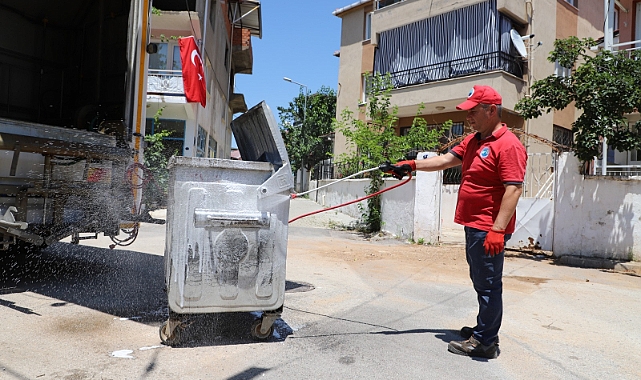 Menderes Belediyesi tüm çöp konteynerlerinin bakım, onarım, temizlik ve dezenfektesini özel ekip ile gerçekleştiriyor.