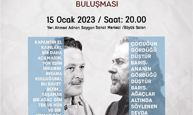 İzmir Büyükşehir Belediyesi Kent Arşivi, Müzeler ve Kütüphaneler Şube Müdürlüğü, Nâzım Hikmet Ran'ın 121. doğum günü için özel bir etkinlik düzenliyor. Büyük şair, aynı dönemde yaşayan ve Nâzım’ın şiirlerini Yunancaya çeviren büyük şair Yannis Ritsos ile hatırlanacak. Şiir ve iki dilde şarkılardan oluşan etkinlik, 15 Ocak Pazar günü 20.00'de Ahmed Adnan Saygun Sanat Merkezi'nde ücretsiz düzenlenecek.