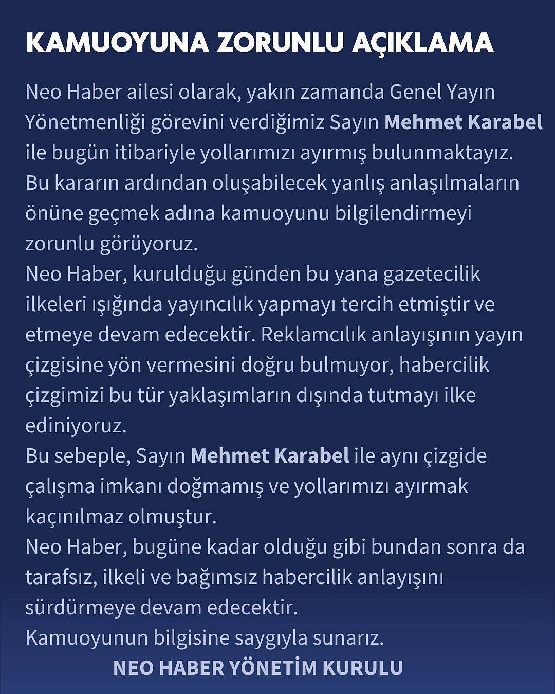 Neo Haber Yönetim Kurulu, yaptığı yazılı açıklama ile Genel Yayın Yönetmenliği görevini bir süre önce üstlenen Mehmet Karabel ile yollarını ayırdığını kamuoyuna bildirdi.