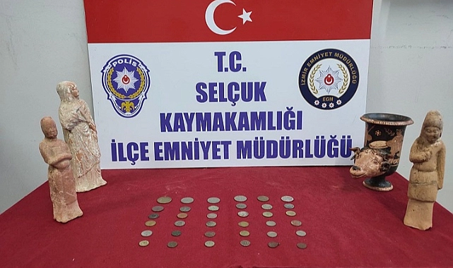İZMİR (AA) - İzmir'in Selçuk ilçesinde bir otomobilde tarihi değere sahip 3 heykelcik, 1 vazo ile 36 sikke ele geçirildi.