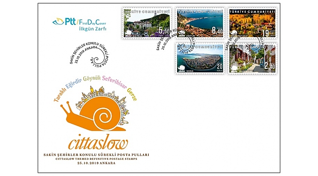 PTT tarafından Türkiye’nin huzurlu, sakin ve yaşanılabilir yerleşim yerlerinden olan Seferihisar, Göynük, Taraklı, Eğirdir ve Gerze görsellerine yer verilerek hazırlanan 5 değerli “Sakin Şehirler” konulu sürekli posta pulları ve ilk gün zarfı 25 Ekim 2019 tarihinde tedavüle sunuldu.
