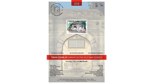 Posta ve Telgraf Teşkilatı Anonim Şirketi (PTT A.Ş.), “Tarihi Çeşmeler” konulu anma pulunu 31 Ocak 2018 tarihinde tedavüle çıkaracak. Kanuni Sultan Süleyman Çeşmesi görselinin yer aldığı 36x52 milimetre boyutundaki anma pulu 2 TL bedelle, söz konusu pula ait 140x210 milimetre boyutundaki ilk gün zarfı ise 3 TL bedelle PTT işyerlerinde, www.filateli.gov.tr adresinde ve filateli cep uygulamasında satışa sunulacak.