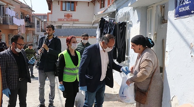 Konak ilçesine bağlı Tepecik Mahallesi'ne gelen Purçu, İzmir Büyükşehir Belediyesinin erzak paketi dağıtımına katıldı.