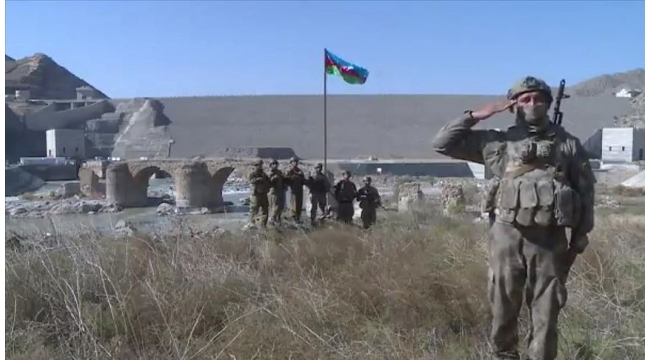 Azerbaycan Cumhurbaşkanı Aliyev, Azerbaycan askerlerinin tarihi Hudaferin Köprüsü'ne Azerbaycan bayrağı diktiğini açıkladı.