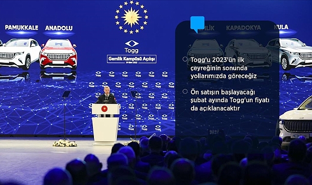 Erdoğan, Togg'u 2023'ün ilk çeyreğinin sonunda yollara görüleceğini söyledi.