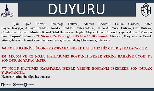 İzmir Büyükşehir Belediyesi ESHOT Genel Müdürlüğü, 21 Nisan Pazar günü koşulacak Maraton İzmir nedeniyle bazı ESHOT ve İZTAŞIT hatlarında geçici güzergâh değişiklikleri yapacak. İZDENİZ’e bağlı Bostanlı-Üçkuyular Feribotu da aynı gün 08.30-12.00 saatleri arasında çalışmayacak. Yerine yolcu gemisi seferleri düzenlenecek. Maraton katılımcılarının rahat ulaşımı için 05.30’dan itibaren Bostanlı-Karşıyaka-Pasaport iskeleleri arasında ring seferleri yapılacak.