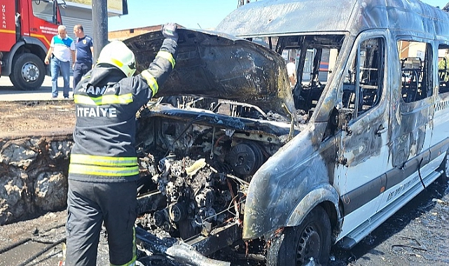 Manisa'nın Turgutlu ilçesinde alev alan yolcu minibüsü, kullanılamaz hale geldi.