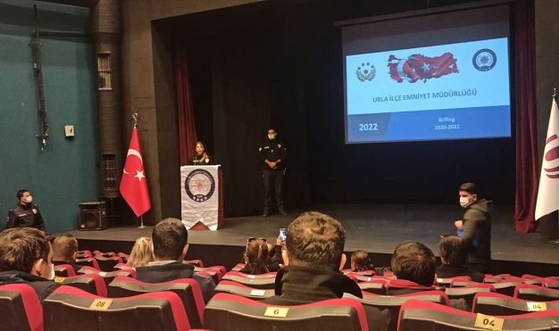 Urla Atatürk Kültür Merkezi'ndeki toplantıya, İlçe Emniyet Müdürü Zeynep Erdoğan'ın yanı sıra emniyet müdürlüğünde görevli birim amirleri, bekçiler ve muhtarlar katıldı.