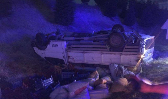 Çarpmanın etkisiyle kamyonet, şarampole devrilip ters döndü.