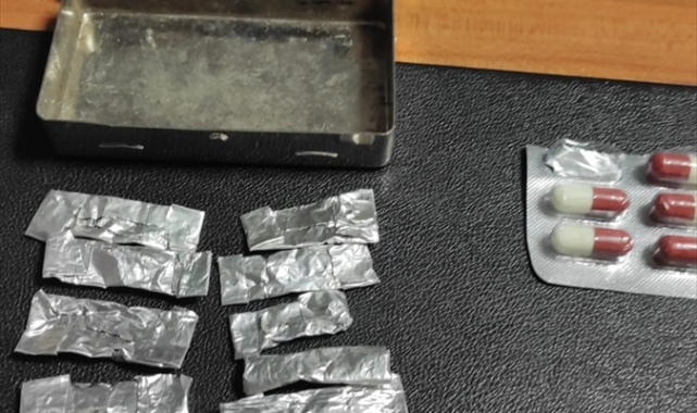 Şüpheli H.U'ya ait evde çeşitli nitelik ve miktarlarda uyuşturucu madde, sentetik hap ve sustalı bıçak ele geçirildi.