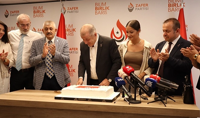 Konuşmasının ardından Özdağ, toplantıya katılanlarla birlikte yıl dönümü pastası kesti.